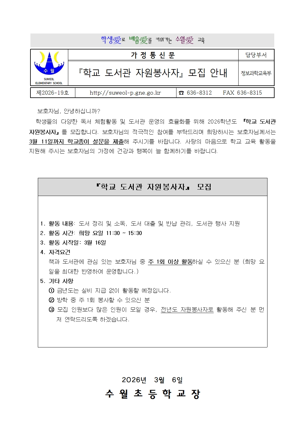 [제2026-19호] 학교 도서관 자원봉사자 모집 안내