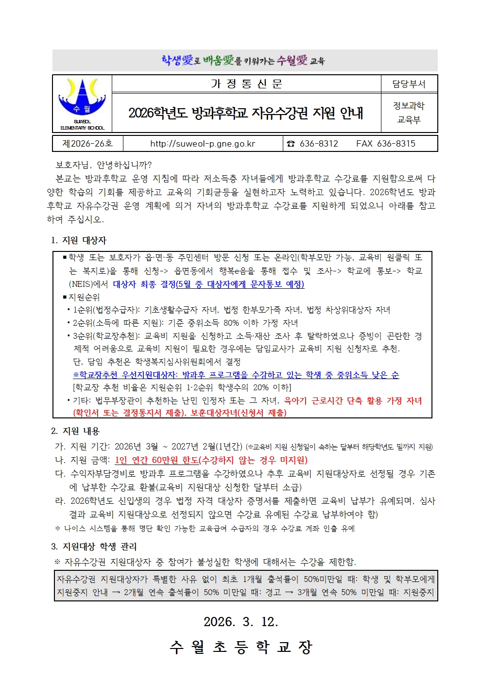 [제2026-26호] 2026학년도 방과후학교 자유수강권 지원 안내