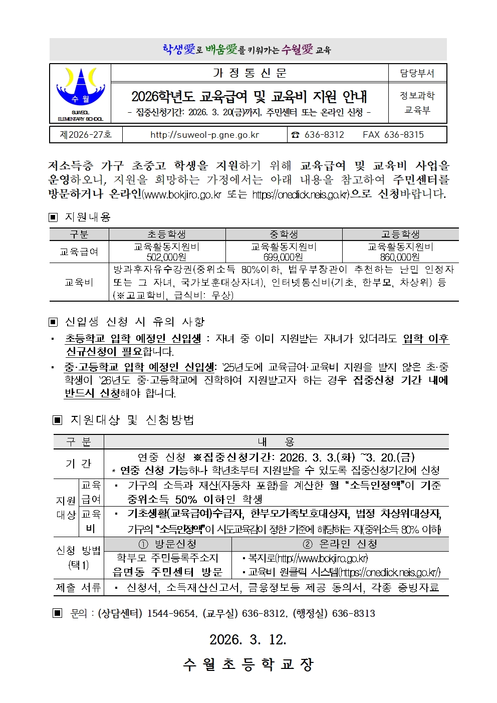 [제2026-27호] 2026학년도 교육급여 및 교육비 지원 안내